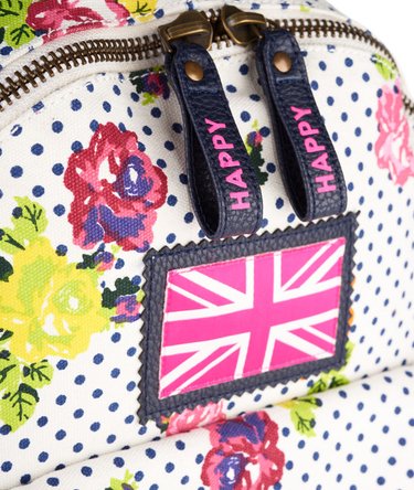 Mochila Happy de Superdry para mujer. Esta mochila es sencilla pero bonita a la vez, con un estampado de flores, asa en su parte superior, correas ajustables y acolchadas en la espalda y un compartimento principal grande. También tiene un bolsillo delantero externo con hebilla y se completa con ribetes de cuero de imitación, la bandera británica y un logo de Happy Superdry bordado por delante. Capacidad aproximada de 18 litros.