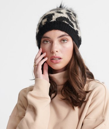 Gorro con estampado de leopardo Lisa de Superdry para mujer. Ve a la moda esta temporada con este gorro que luce un estampado integral de leopardo, una suave borla en la parte superior y ribete de canalé. También lleva un logo metálico de Superdry encima del ribete.