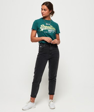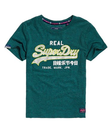 Camiseta flúor con logo Vintage de Superdry para mujer. Esta camiseta presenta cuello redondo clásico, manga corta, un gráfico con el logo en el pecho con contorno flúor y una etiqueta con el logo en una manga. Se completa con un parche del logo encima del bajo.