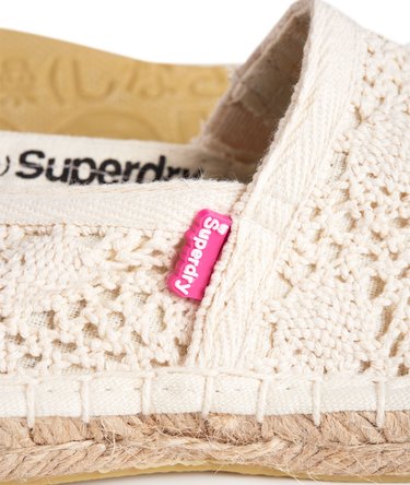 Alpargatas Crochet de Superdry para mujer. Unas alpargatas clásicas con una etiqueta del logo de Superdry en su parte superior y la marca Superdry en la suela.